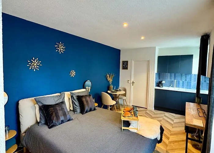 Om van uw vakantie in Reims te genieten, verblijf in Evasion Bleu Champagne & Son Parking Prive Appartement Reims, gelegen op circa 1 km afstand van de Église Saint-Jacques en op loopafstand van 25 minuten van de Basiliek van Sainte-Clotilde.